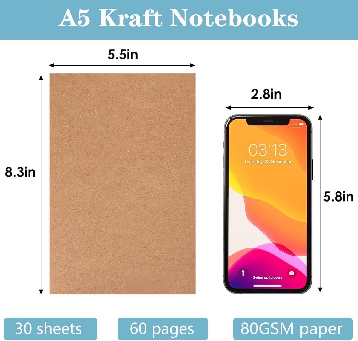 - 4 Pack A5 Kraft Notebooks contains :You will receive a set of 4 Pack A5 Kraft Notebooks, each with 30 sheets/60 pages, very cost-effective, inexpensive, high quality,The handy size is smaller than a standard composition notebook, making you carry and hold easily.