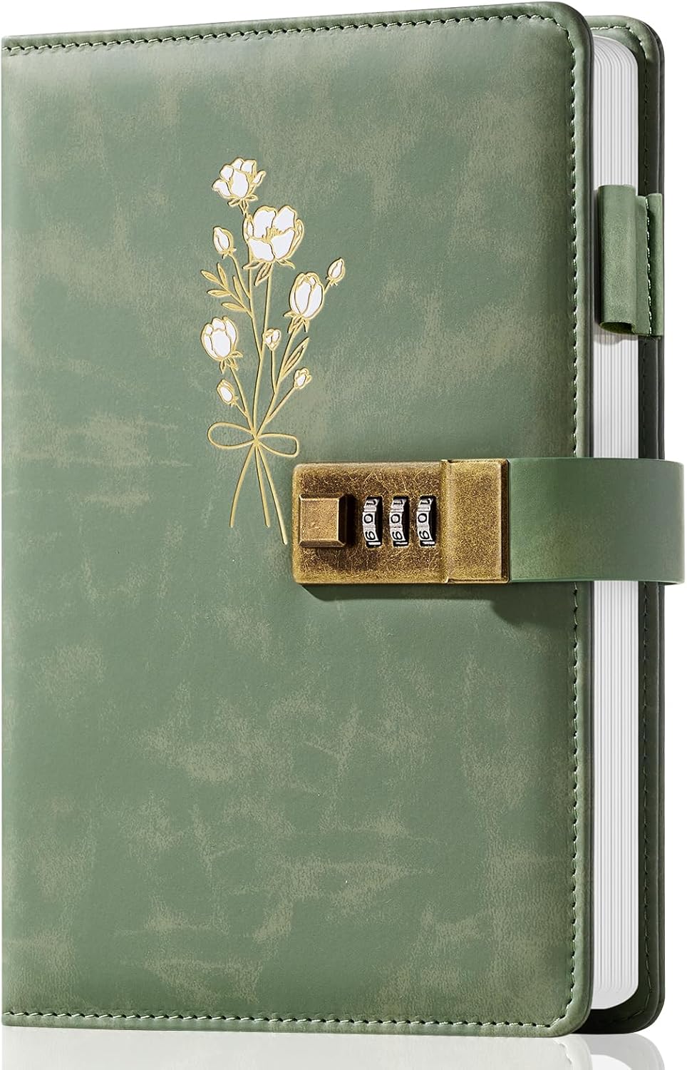 Locked diary, A5 leather diary, 260 pages, 100GSM Paper, suitable for girls and teenagers, secret floral pattern, replaceable refills, lockable diary, combination lock, 5.7 inches x 8.3 inches, green