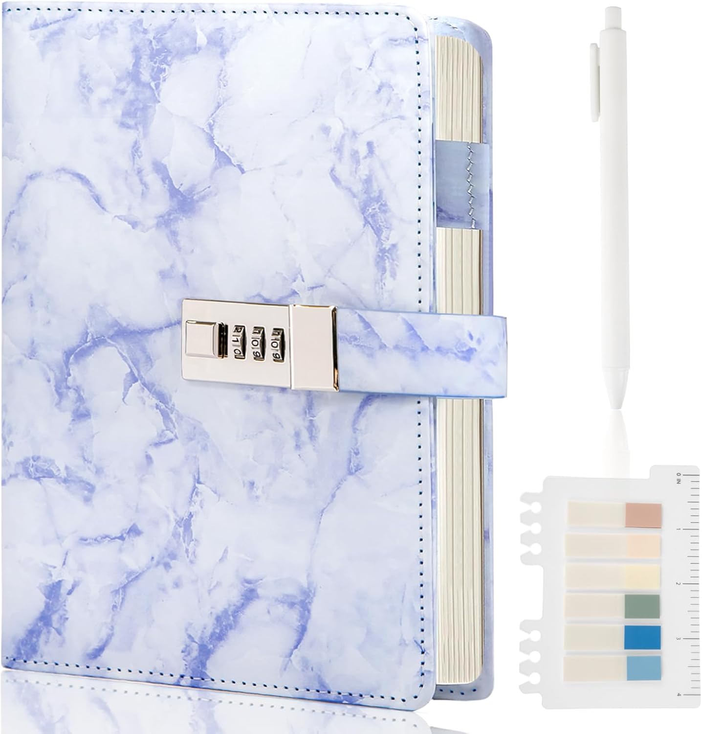 - 【100GSM College Ruled Paper, No Ink Bleeding】 Whether you write with a pen, ballpoint pen or pencil, the content on diary paper is clearly legible. Each marble diary measures 8.6” x 5.8” which is bigger than the average password diary. Locking diary has 192 college ruled pages.