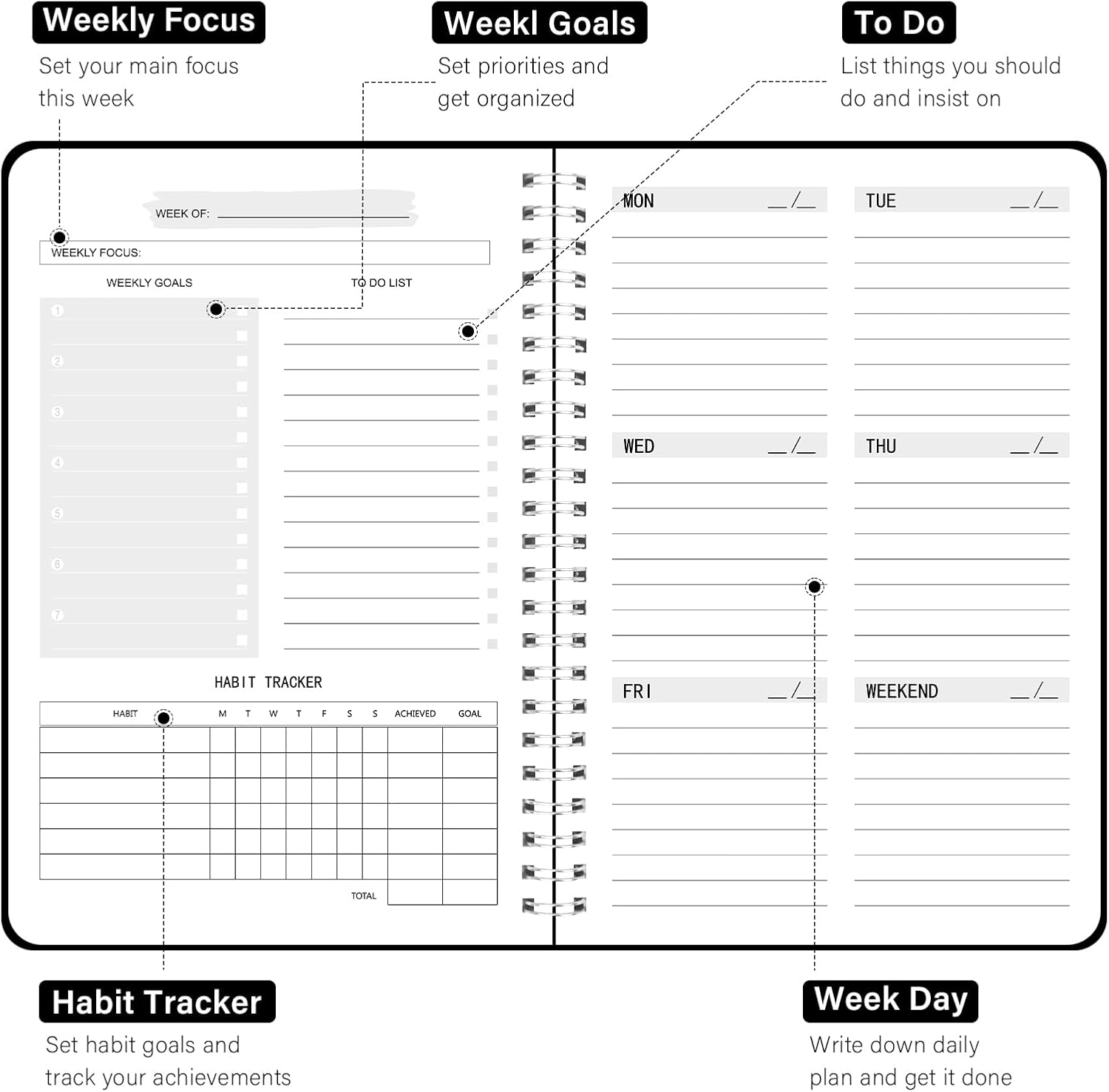 - ✍BOOST YOUR PRODUCTIVITY: Our weekly planner is designed to meet all your needs, weekly goals, To Do list, and habit tracker together for daily affairs. Track healthy habits for each week and use the checkbox as a visual reminder. With clear weekly views, priority blocks, and note columns, you can effectively manage your time and tasks.